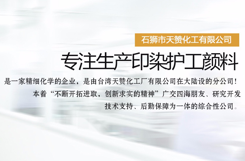 石獅市天贊化工有限公司是一家生產(chǎn)印染護工顏料的公司,是一家精細化學(xué)的企業(yè),是由臺灣天贊化工廠有限公司。在大陸設(shè)的分公司!本著“不斷開拓進取,創(chuàng)新求實的精神”廣交四海朋友、研究開發(fā)、技術(shù)支持、后勤保障為一體的綜合性公司。二十年來,我們對紡織,前處理,后整理,技術(shù)的研究實踐中體會得經(jīng)驗。